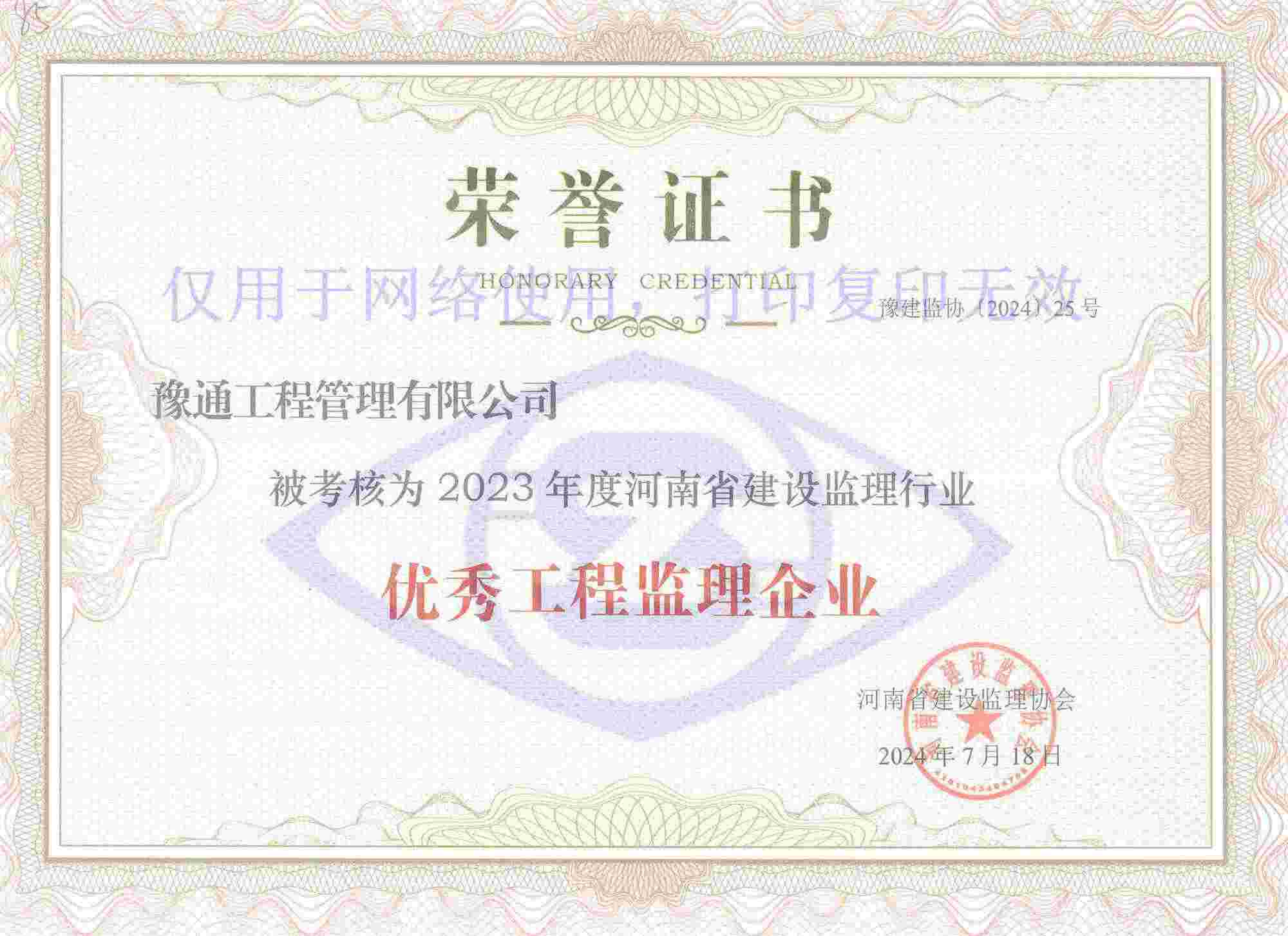近日,河南省建設監理協會發布了關于公布2023年度會員單位考核結果的通知(豫建監協〔2024〕25號),我公司榮獲“2023年度優秀工程監理企業”稱號。