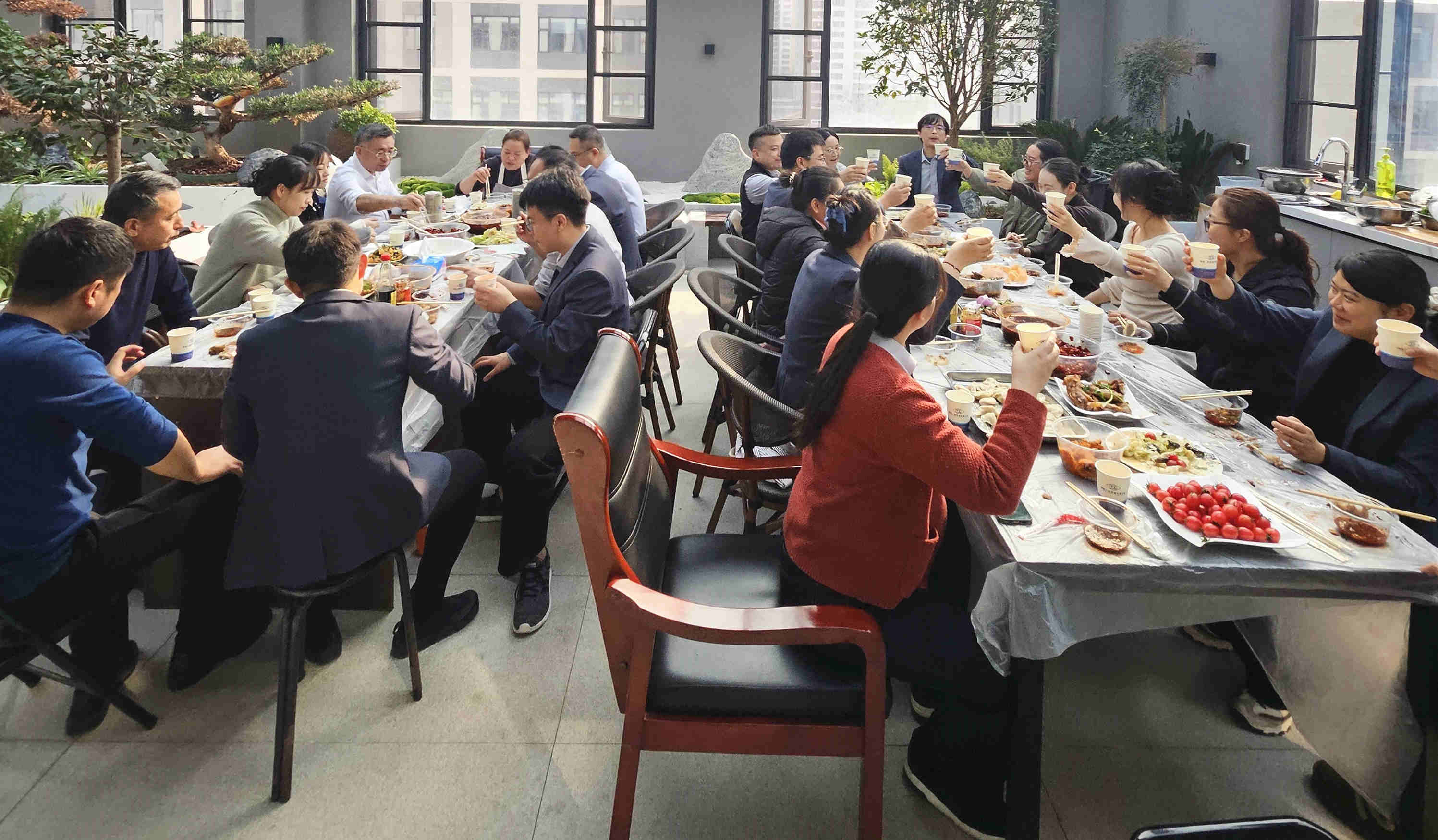 清水飄芙蓉,元寶落玉盤。熱氣騰騰的餃子陸續出鍋,誘人的香氣彌漫開來。員工們圍坐在一起,品嘗著親手制作的美味成果,醋香、辣油各取所愛,咬一口餃子,暖意從舌尖直達心底,瞬間驅散了冬日的寒意。大家一邊享用美食,一邊分享工作趣事,這一刻,忙碌的工作壓力煙消云散,取而代之的是節日的喜悅和滿滿的歸屬感。