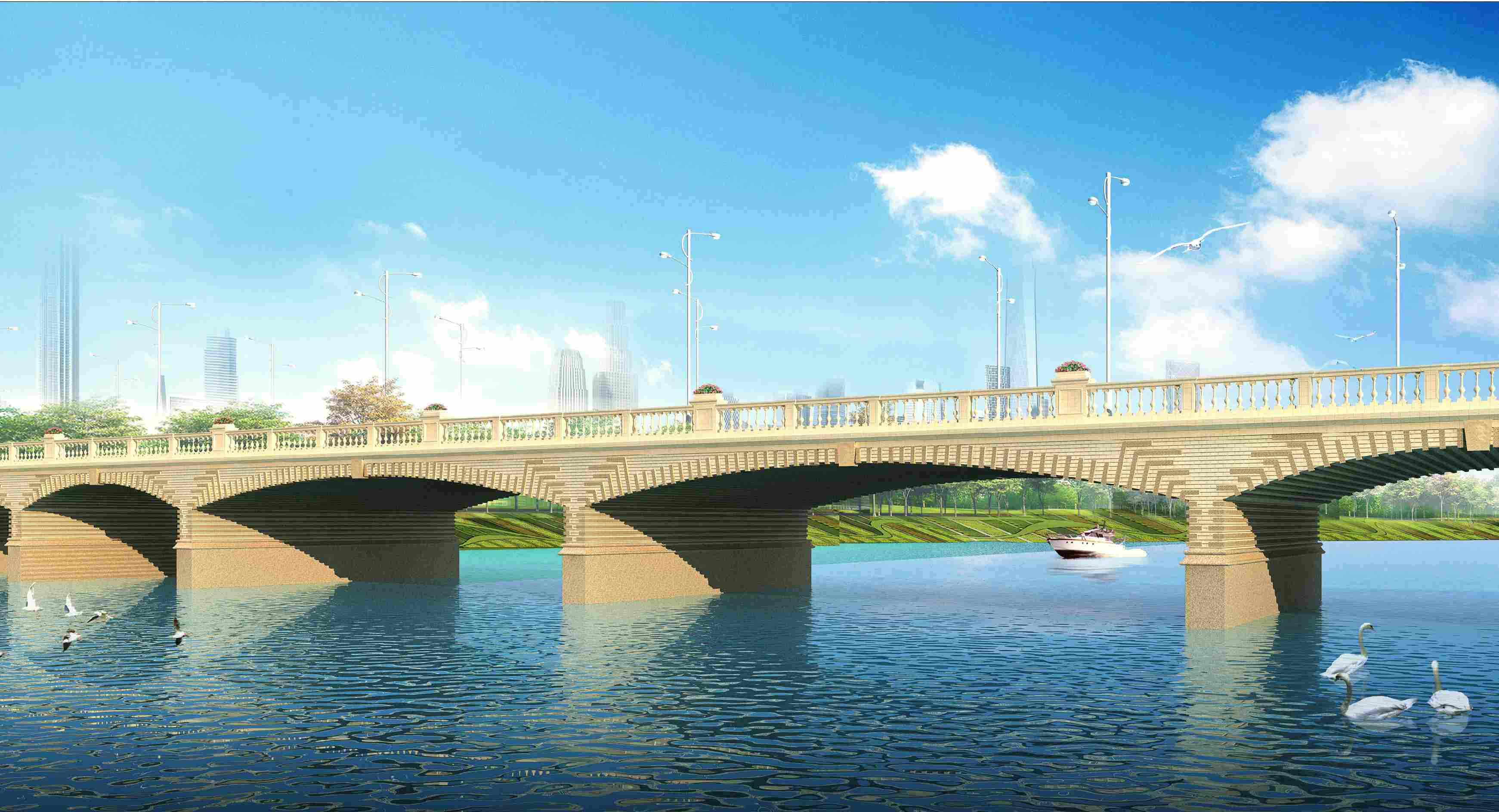 漯河市太白山路沙河橋位于漯河市太白山路沙河橋上,橋南與涇河路相接,橋北與遼河路相連,規劃為城市主干道,行車速度60KM/h,太白山路橋北引道長360.92m(其中跨濱河路橋為1×20m),南引道長254.92m(其中跨沙南新路橋為1×20m),道路總長度為980m。